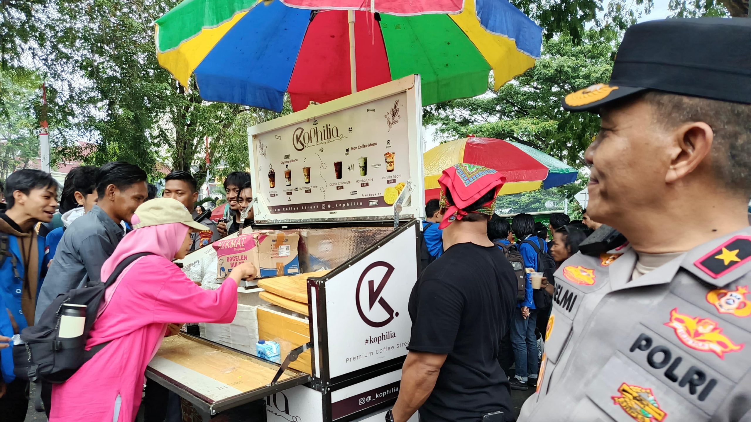 Hal serupa terjadi di lapak kopi. Para mahasiswa tampak antusias membantu penjual yang kewalahan melayani pembeli.