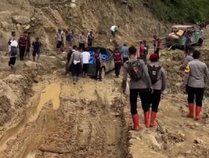 Perjalanan menuju Kecamatan Pining dihadapkan pada berbagai kendala, mulai dari jalan licin, lumpur tebal, hingga material banjir yang menutup hampir seluruh jalur. Di sejumlah titik, rombongan harus berhenti dan menunggu alat berat membuka jalan. Kapolres bersama unsur pemerintah daerah secara langsung mengawal proses pembukaan akses agar jalur dapat segera dilalui.