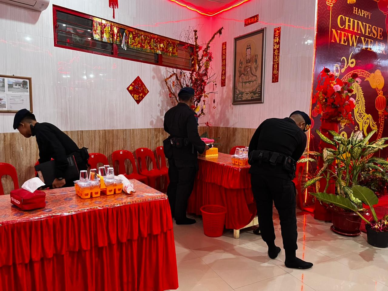 Sterilisasi dilakukan secara menyeluruh di area dalam dan sekitar tempat ibadah guna memastikan tidak adanya benda mencurigakan atau berbahaya yang dapat mengganggu jalannya ibadah perayaan Imlek.